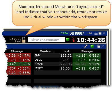 当魔方布局被解锁后,工作空间的外框变为绿色,锁定标示为解锁状态。当解锁后,工作空间内的窗口变为分开的,独立的窗口,您能够移动窗口、改变尺寸和添加新的窗口。