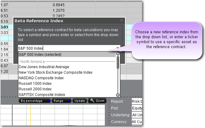 The first time you turn on Beta Weighting from the View menu, the Beta Reference Index box is displayed. This allows you to select a benchmark index other than the default S&P 500, or manually enter a ticker symbol and define a specific stock as the reference contract.