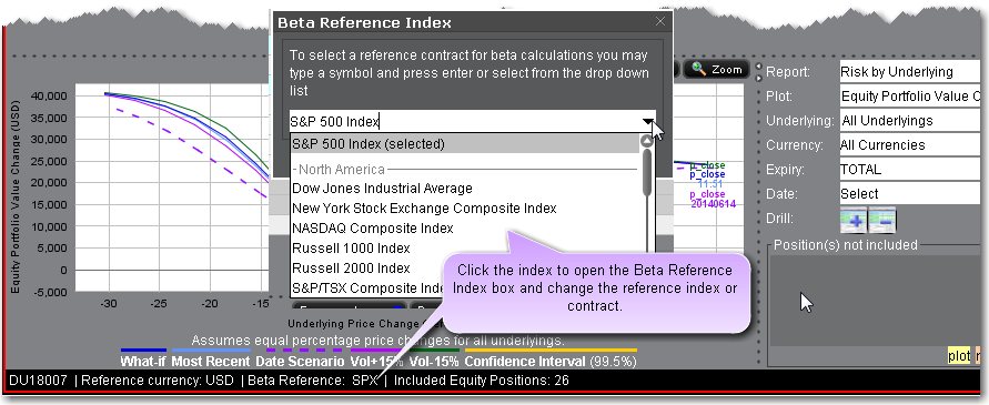 You can elect to modify the reference contract at any time by clicking the current Beta Reference symbol in the information bar along the bottom of the Risk Navigator.