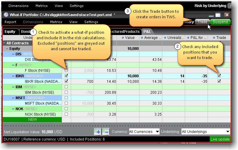 当您从一个假设头寸起始一个定单时,风险漫游将在TWS%TRADE_SYSTEM_ACRONYM%中创建一个定单,其执行将模仿假设头寸生成一个头寸。也就是如果您对一个您已经持有的底层证券创建一个定单,定单的数量将按当前持有的头寸进行计算。例如,如果您当前持有100股IBKR头寸,您对IBKR创建一个700股假设头寸交易,则TWS%TRADE_SYSTEM_ACRONYM%中的定单数量将是600股。