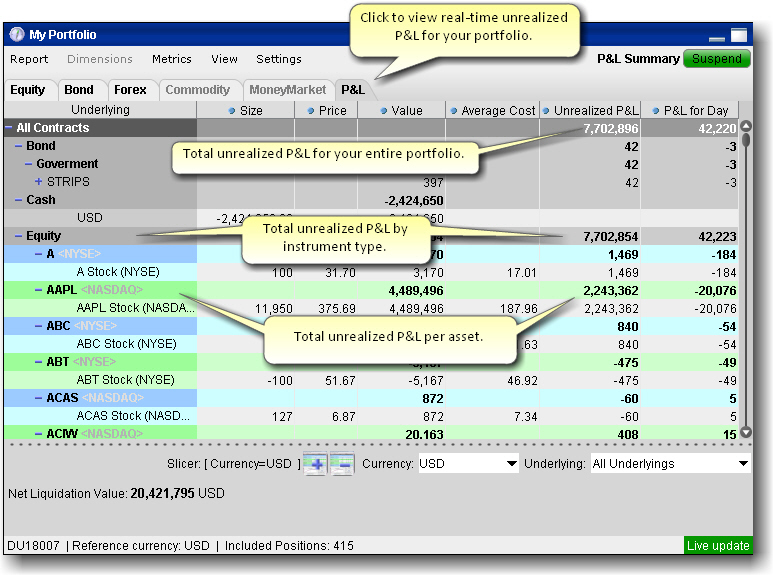 益&损总结报告显示您投资组合中所有合约的收益和损失值。显示按资产类型排列,包括您投资组合总益&损、资产类别总益&损、每个资产的当前益&损。