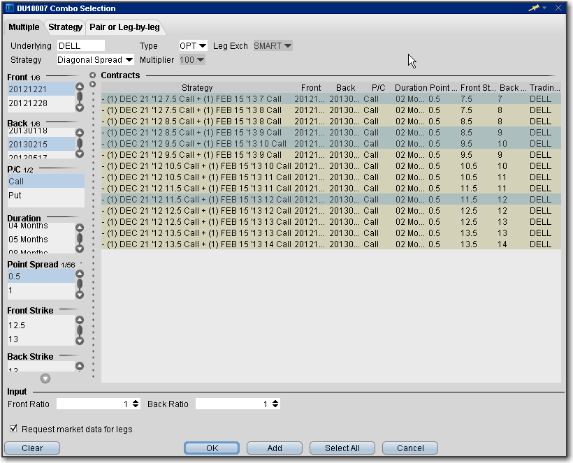 使用多种标签同时对同一底层证券创建一组不同的单个组合定单。 对某些策略,包括对角价差、盒、宽跨式 、风险翻转和垂直价差 , 有可以用点价差来过滤。