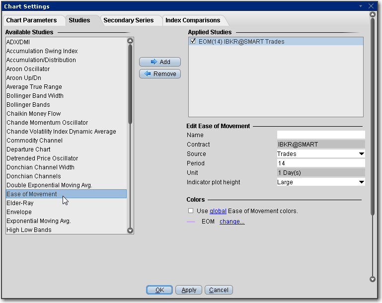 - 选取简易波动(Ease of Movement)并点击添加将指标添加应用指标中。