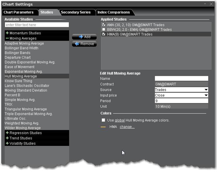 - 选取船型移动平均(Hull Moving Average)并点击添加指标。