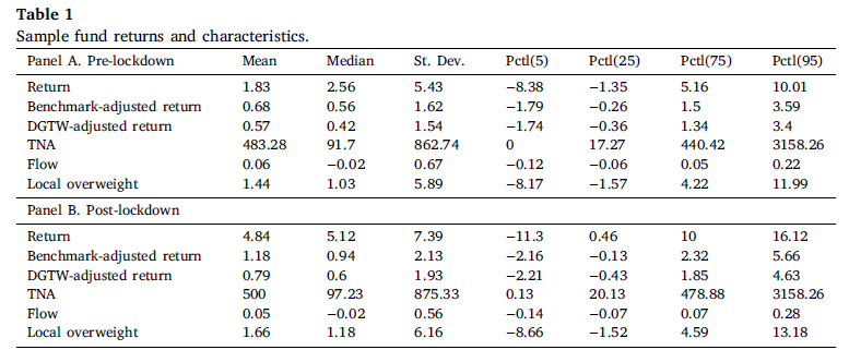 After lockdowns, monthly benchmark-adjusted and DGTW-adjusted returns on local portfolios were about 0.2 to 0.4 percentage points lower than on distant portfolios, relative to the pre-lockdown period. For an average pre-lockdown local portfolio of $277 million, the paper estimates that a 0.4 percentage point monthly drop implies an annualized loss of roughly $13.3 million per fund.