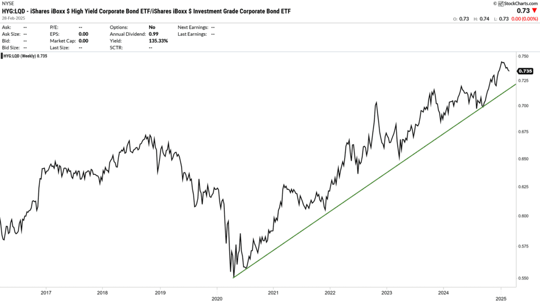 The HYG/LQD ratio (High Yield vs. Investment Grade) provides insight into whether investors are favoring risk or credit quality.