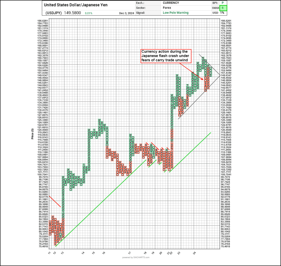 On July 31, 2024, the Bank of Japan raised its key interest rate to 0.25%, up from 0%, aiming to curb the yen’s sharp decline against the U.S. dollar. This move strengthened the yen, which had dropped to around 160 yen per dollar, a concern for Japan given its reliance on imports like oil and food. Just four months earlier, Japan had raised rates above zero for the first time in 17 years. In August, Japan’s stock market experienced a significant drop, with the Nikkei 225 index plunging 12.4%, marking its largest one-day percentage loss since 1987. This triggered a global market rout, causing major losses worldwide, though the impact was short-lived. Amid turmoil in South Korea, money flows appear to be shifting, potentially favoring Japan. These developments are particularly relevant to the Japanese carry trade, a strategy where investors borrow yen at low rates to invest in higher-yielding, appreciating assets abroad, such as the U.S. dollar. While the carry trade can be profitable due to the interest rate differential, it carries risks like currency fluctuations, rising interest rates, and global market volatility, which could lead to significant losses if conditions change. Currently, these risks seem muted as Japan-focused ETFs are experiencing strong point-and-figure breakouts. However, many of these positions remain in the neutral zone according to SIA reports, particularly the SIA All CAD ETF Report, which tracks 859 unleveraged Canadian ETFs daily.