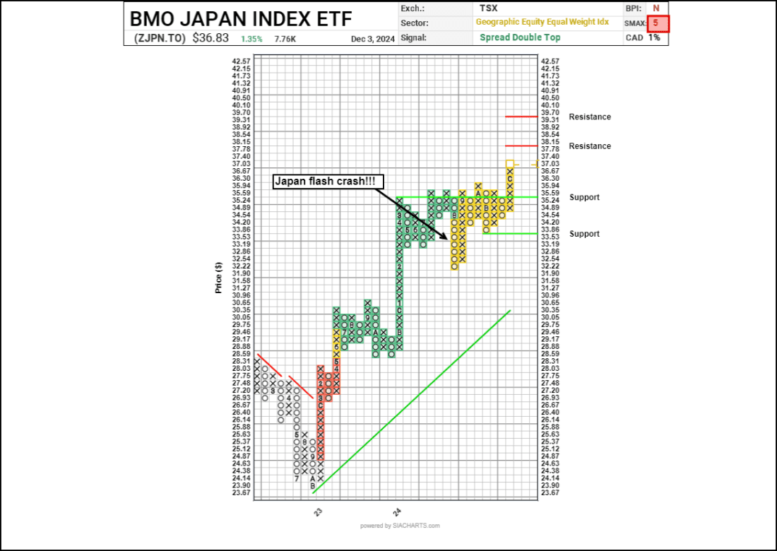 Finally, this point-and-figure chart for BMO Japan ETF shows a strong breakout with multiple double tops, signaling potential continued strength, particularly as the broader market watches for further developments amid the instability in South Korea.