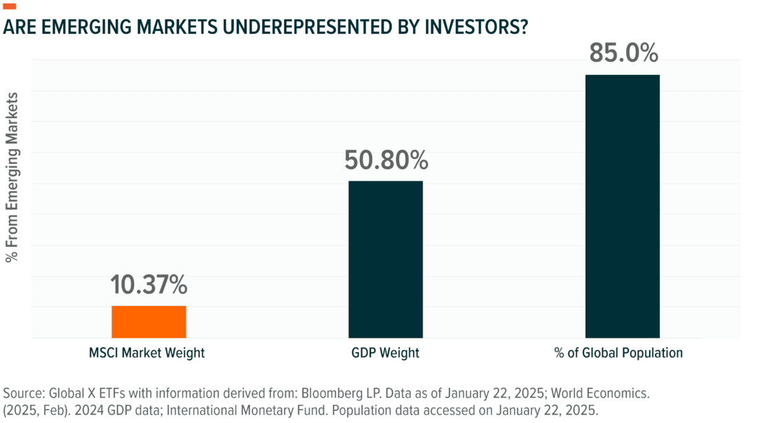 - As of January 2025, the Global X ETF Model Portfolio team allocates between 4% and 5% of its equity exposure to Emerging Markets within its multi-asset model portfolios.