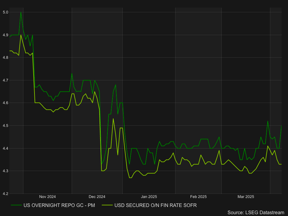 Indeed, it could be a case of liquidity tightening, as we also saw repo rates trading higher today. Overnight repo rates reached 4.5%, just below the 4.52% level on March 31. This suggests we should see secured overnight financing rates move higher tomorrow morning, suggesting tighter liquidity conditions, similar to what we see at quarter or month end.