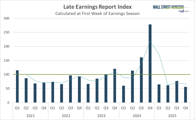 The official pre-peak season LERI reading for Q3 earnings (reports in Q4) stands at 56, the lowest Q4 LERI ever recorded. This is well below the baseline reading, suggesting when companies announced their earnings dates they were feeling more certain about economic conditions. As of October 15, there were 61 late outliers and 98 early outliers. This is the third quarter in a row that the number of outliers are significantly higher than usual. For Q4 2025 the total is 159 vs. Q4 2024 where there were only 139 outliers, showing that more companies are scheduling earnings dates outside of their typical date range.