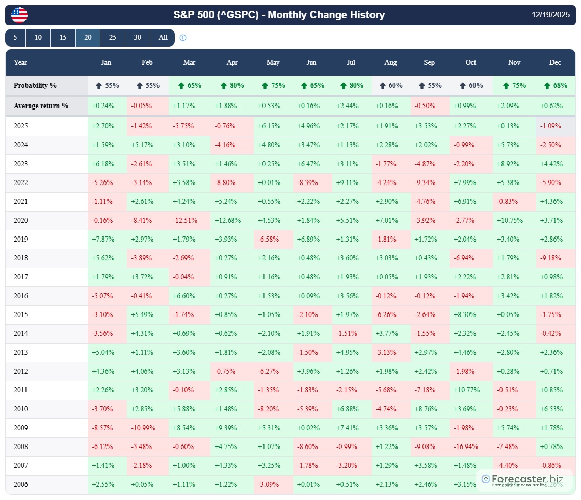 Historical monthly returns of the S&P 500, including average returns and the frequency of positive months (“Probability %”). The table highlights recurring seasonal tendencies across calendar months, providing statistical context rather than predictive signals. Source: S&P 500 seasonality table.