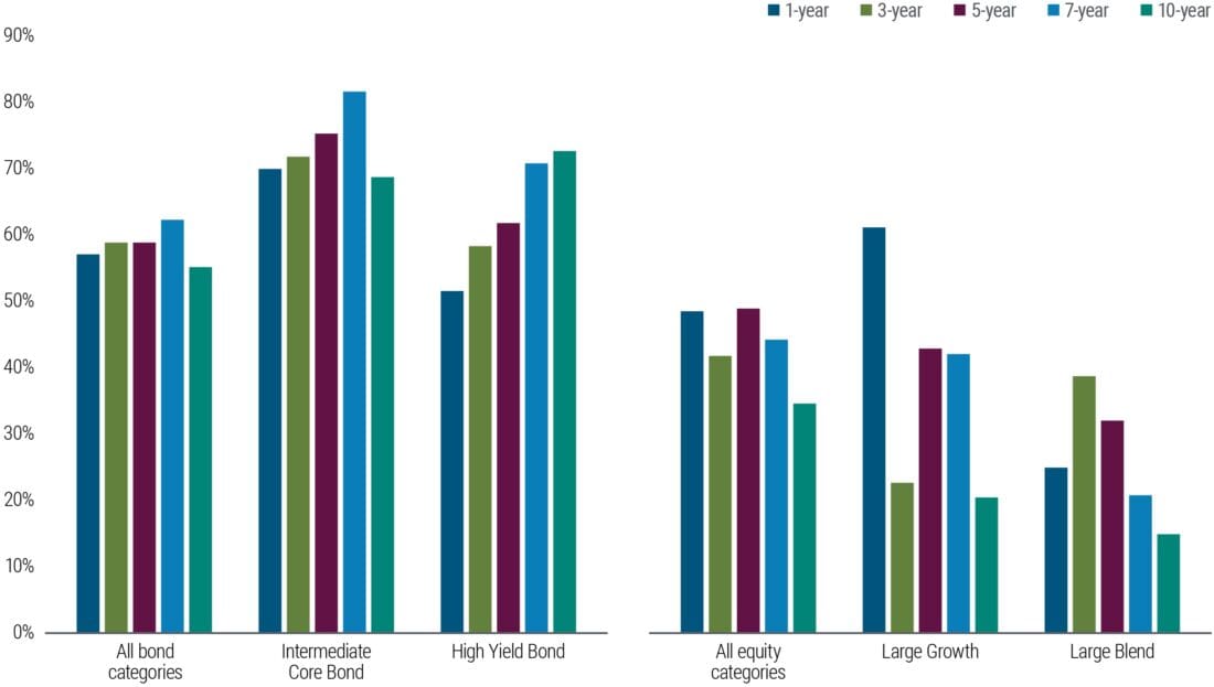 Based on U.S. ETFs and open-end funds (institutional shares only) with at least one-year return history. All bond categories includes Morningstar Intermediate Core Bond, High Yield Bond, Short-Term Bond and Global Bond categories. All equity categories includes Morningstar Large Growth, Large Blend and Large Value categories. To avoid potential survivorship bias, we included ETFs and funds that were live at the beginning of each sample period but were liquidated or merged at any point in time during the reported period. The figure is provided for illustrative purposes and is not indicative of the past or future performance of any PIMCO product.