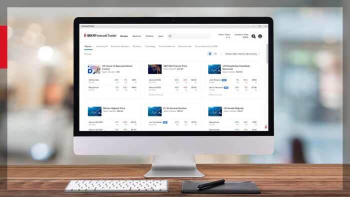 ForecastTrader by Interactive Brokers is a prediction market platform enabling binary yes-or-no positions on political, economic, financial, and climate events through contracts priced $0.02-$0.99 with capped risk and $1.00 payouts for winners.