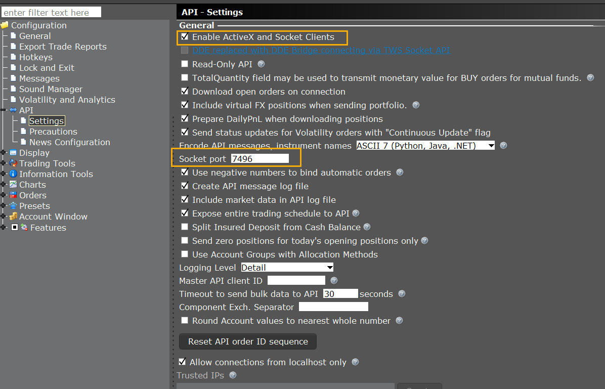 • By default, the ActiveX sample connects on port 7496, so let’s make sure this option is selected as well.