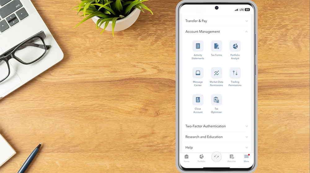 From the IBKR Mobile app, use the More menu in the bottom right corner to access additional tools.