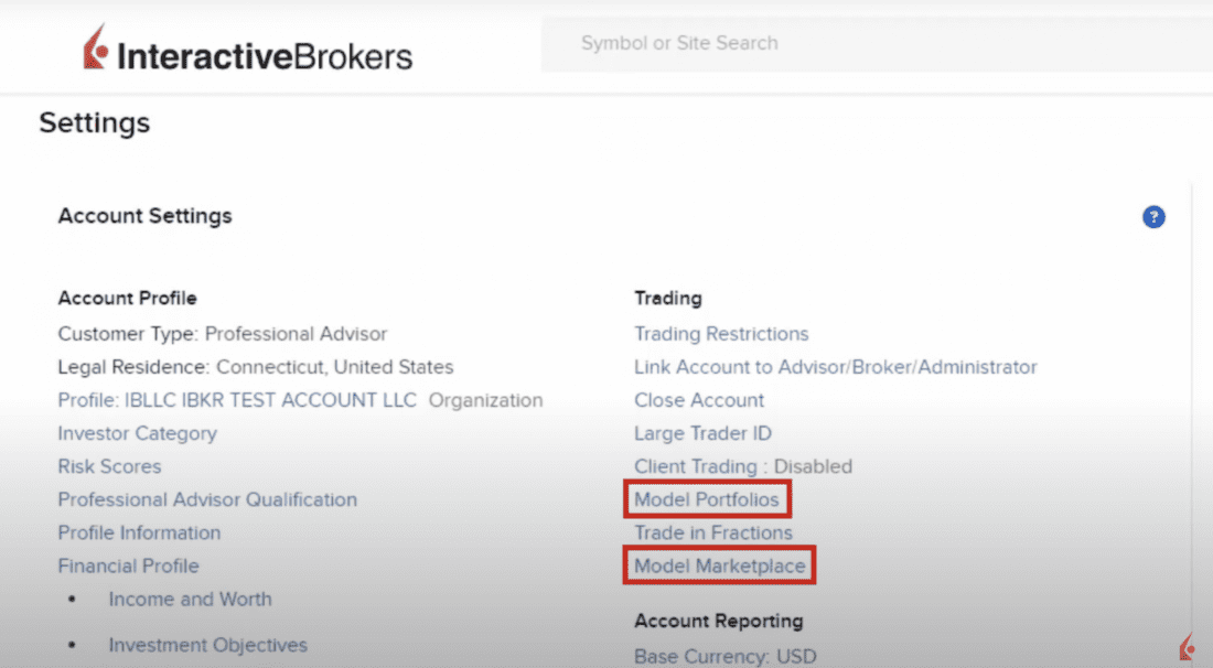 In order to use models and access the Model Marketplace, you must first enable both Model Portfolios and Model Marketplace in the Advisor Portal. Click on the Person icon on the top right of the screen, and settings. This will take the Advisor to the Account Settings screen. Under Trading, the advisor must enable both Model Portfolios and Model Marketplace to subscribe to these services.