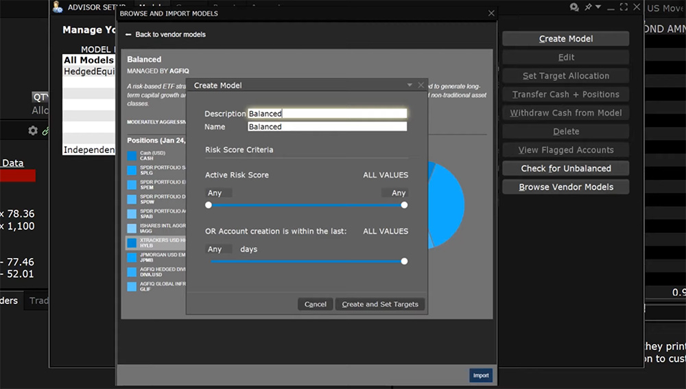 The Advisor Model Marketplace provides a collection of investment models designed by third-party vendors. Search, download and then use selected models in TWS Model Portfolios to manage your clients’ investments.