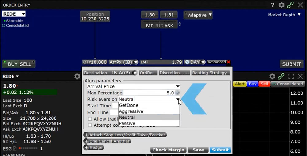 Next, click on the order type drop-down box, scroll down to IBALGO, and select Arrival in the side car window that appears. The Advanced window will appear and in Algo parameters section Arrival Price will be on the first drop-down line.