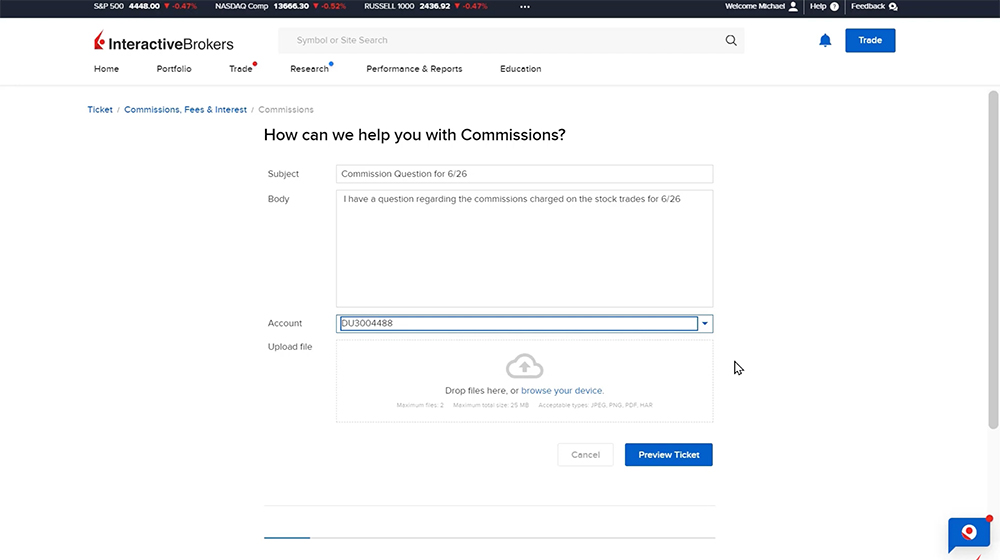 To submit a new inquiry, click the Compose button. The investor can submit a new inquiry ticket or submit Trade Cancellation Requests or Pattern Day Trader Requests. In this example, the investor clicks New Ticket and selects the topic their inquiry is about. Say the investor has a commissions related question. They’ll select Commissions, Fees & Interest then select the sub-topic such as “Commissions”.