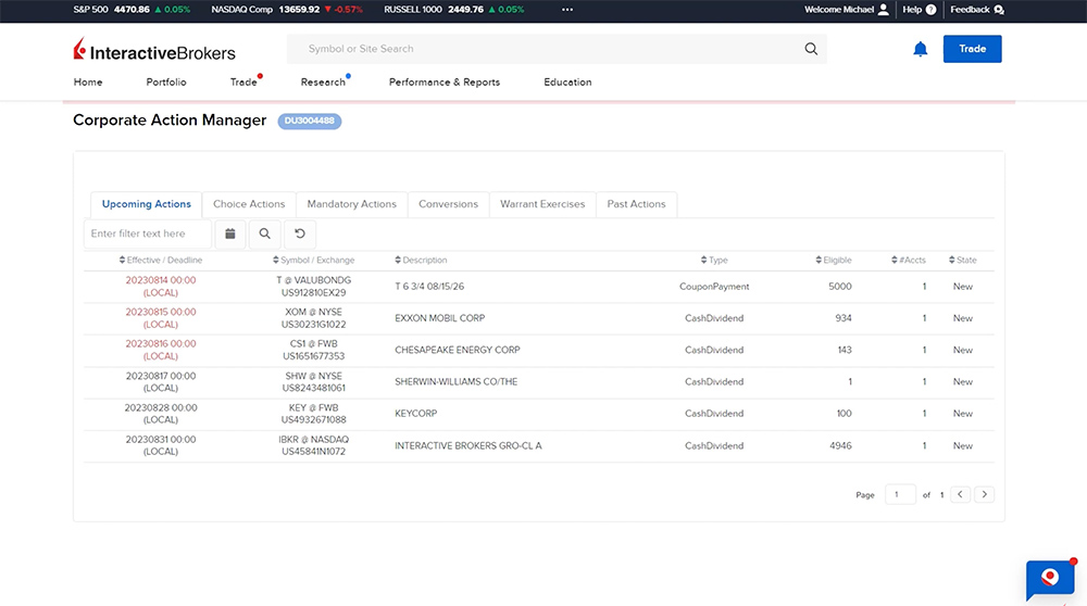 The Corporate Action Manager allows investors to review information on upcoming corporate actions relating to their account. The tool displays information on both mandatory and voluntary actions and allows investors to submit elections to IBKR for voluntary offers. When a voluntary corporate action election is submitted, IBKR will send confirmation to the Message Center within 30 seconds of the acceptance of the submitted choice. In the event a confirmation is not received, the investor must contact IBKR as non-confirmed elections will not be processed.