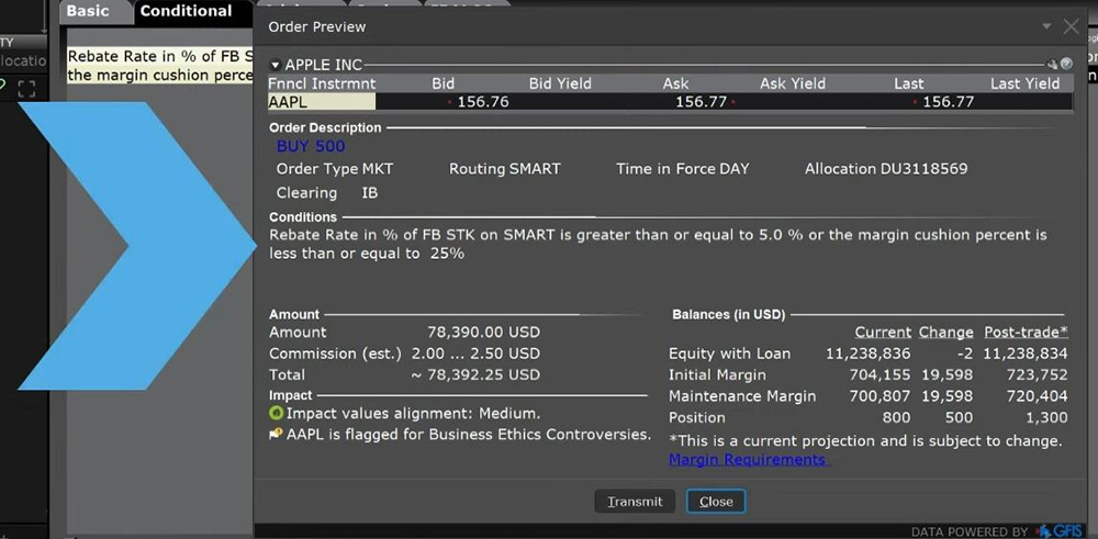 We will now walk through creating a conditional order in Mosaic to buy 500 shares of AAPL at the market if the rebate rate in Meta – symbol FB – becomes greater than or equal to 5%, or the margin cushion is 25% or lower. And choose to allow the conditions to be satisfied outside of regular trading hours. Later, we will then edit the existing order to change the margin cushion from 25% to 20%.
