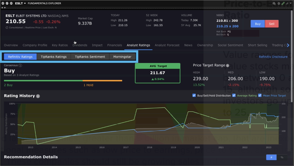 Back at the top, I’ll select Analyst Ratings. This shows Refinitive, TipRanks Ratings, TipRanks Sentiment and Morningstar. Within Morningstar, you can select from the menu on the left, Valuation, Economic Moat, which we will cover in a later lesson and a business description.