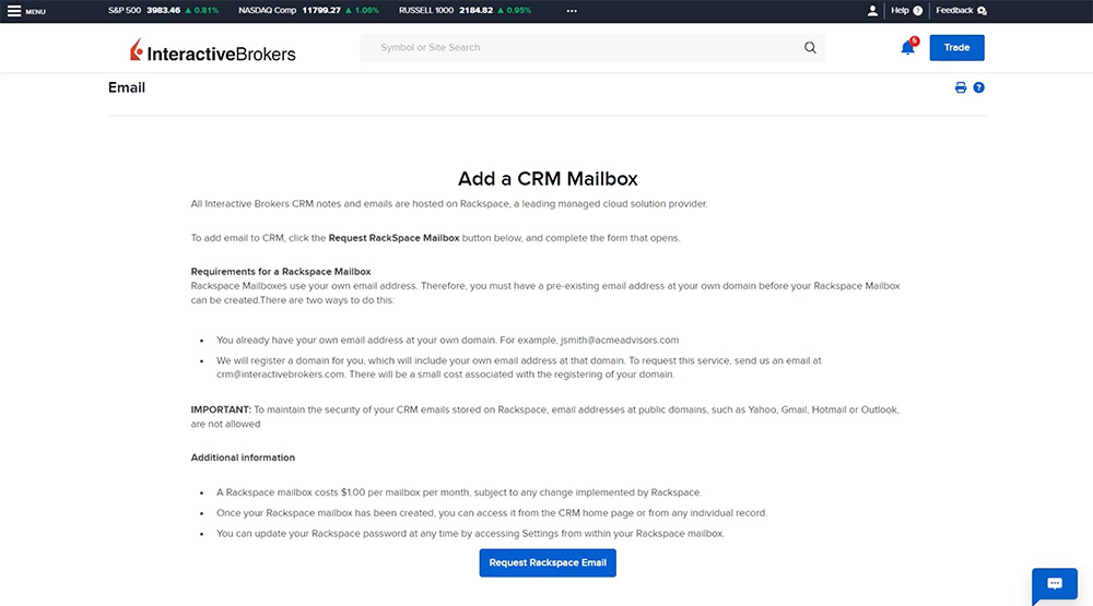 Also within the Administration & Tools menu is the Email page. Interactive Brokers partners with third-party cloud management solution provider Rackspace to provide secure storage for the advisor’s emails. IBKR neither stores nor has access to that data.