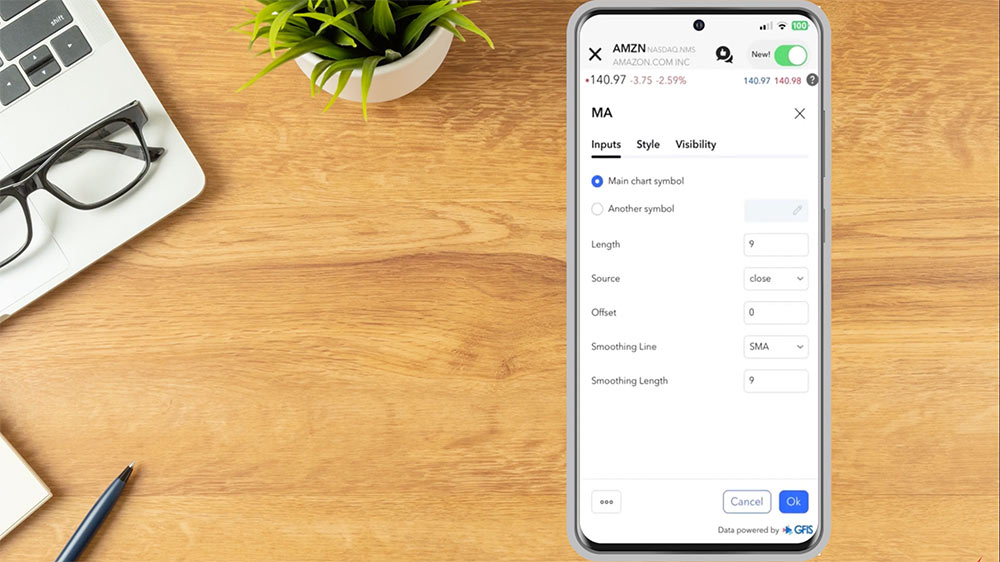 To add studies to the chart, tap the Indicators icon. Investors can use the search bar to search for a specific indicator or browse from the list, and tap on the study to add. In this example, the investor would like to add a Moving Average onto the chart. From the menu, the investor taps Moving Average. The study is now displayed on the chart and, in the upper left corner of the chart, the investor will see the study’s name displayed. Tap on MA and select the Configure gear icon to edit the Inputs, Style, or Visibility of the selected study, and select Ok to save.