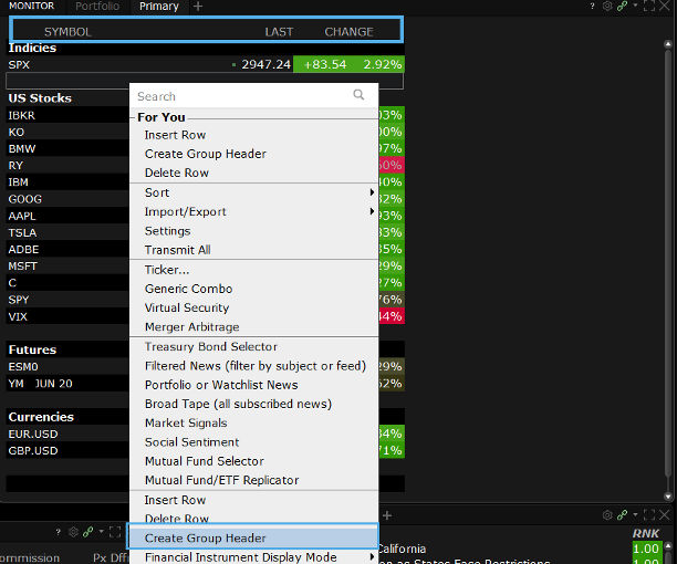 - A jobb átláthatóság érdekében csoportosíthatja az instrumentumokat egy fejléc hozzáadásával: kattintson jobb gombbal a Financial Instrument (Pénzügyi instrumentum) oszlopban, majd a menüben kattintson a Create Group Header (Új fejléc alá csoportosítás) pontra.