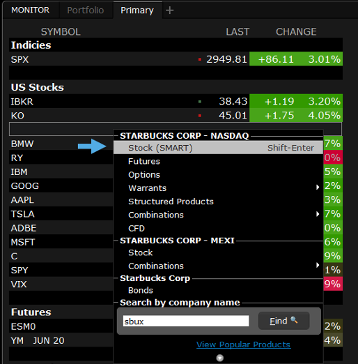 - Ehhez az alapértelmezett Figyelőlistához egyszerűen hozzáadhat további ticker kódokat. Írja be egy üres sorba a ticker kódot, és adja meg az eszköztípust.