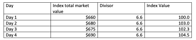 Each day, as the market values of the stocks in the index fluctuate based on changes to their prices, the new total market value of the index is divided by the same divisor (6.6) to produce a new index value as you can see in this example.