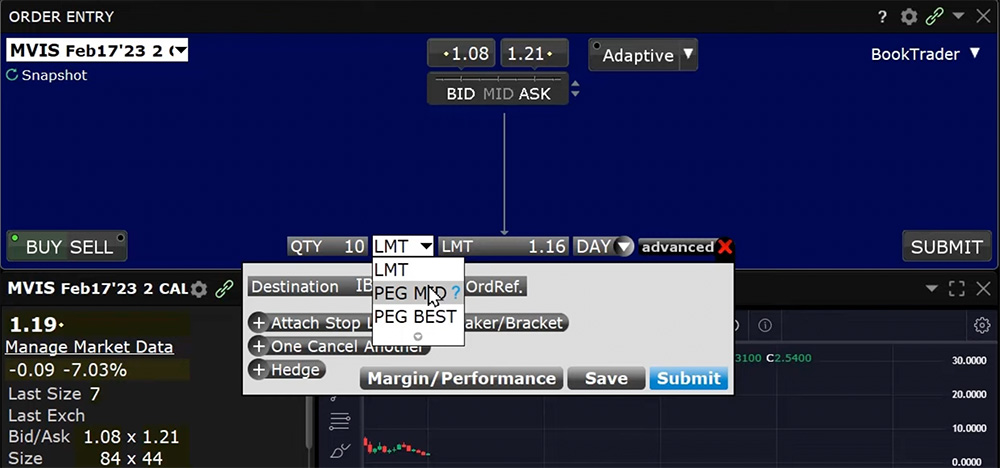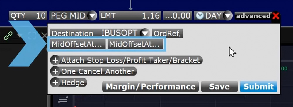 The Interactive Brokers (IBKR) IBUSOPT Pegged-to-Midpoint order type is useful if the investor wishes to rest a nonmarketable order at the midpoint of the National Best Bid and Offer, more commonly known as the NBBO. The IBUSOPT Pegged-to-Midpoint order type also allows the investor to compete for liquidity by adding optional offsets to the mid-price. If the investor chooses to use an offset to comply with the minimum tick rule, IBKR requires two offset values: a primary and secondary offset.
