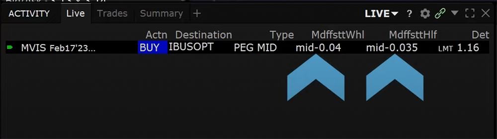 The order will populate the Activity Panel’s order tab showing Peg to Midpoint in the Order Type data column, IBUSOPT in the Destination column, and the offset values in the in the respective columns: Mid Offset at Whole, Mid Offset at Half.