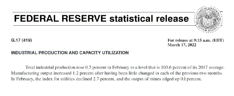 It’s calculated by using a mix of estimates from professional trade organizations and government agencies. Generally, it’s published on or around the fifteenth day of each month at 9:15am eastern time. The FED provides economic data as part of its mission to promote the health of the U.S. economy and the stability of the U.S. financial system.