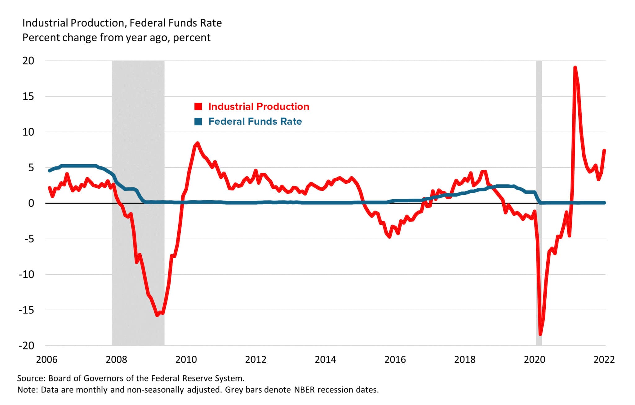Industrial Production Shrank Due To Higher Rates and/or Weaker Consumer Demand in 2008, 2016, 2019 and 2020