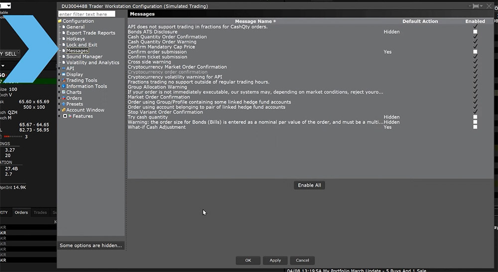 For example, I currently have the Cash Quantity Order Confirmation and Cash Quantity Warnings enabled. As you can see, these messages pop-up when I place an order with a cash quantity instead of a share quantity. I can check the box for Don’t Display This Message Again before transmitting the order which will disable these messages from being received in the future. To confirm these are disabled, open the Global Configuration and the Cash Quantity messages no longer have check marks indicating that they are indeed disabled. I can re-enable by checking the box then selecting Apply and OK at the bottom.