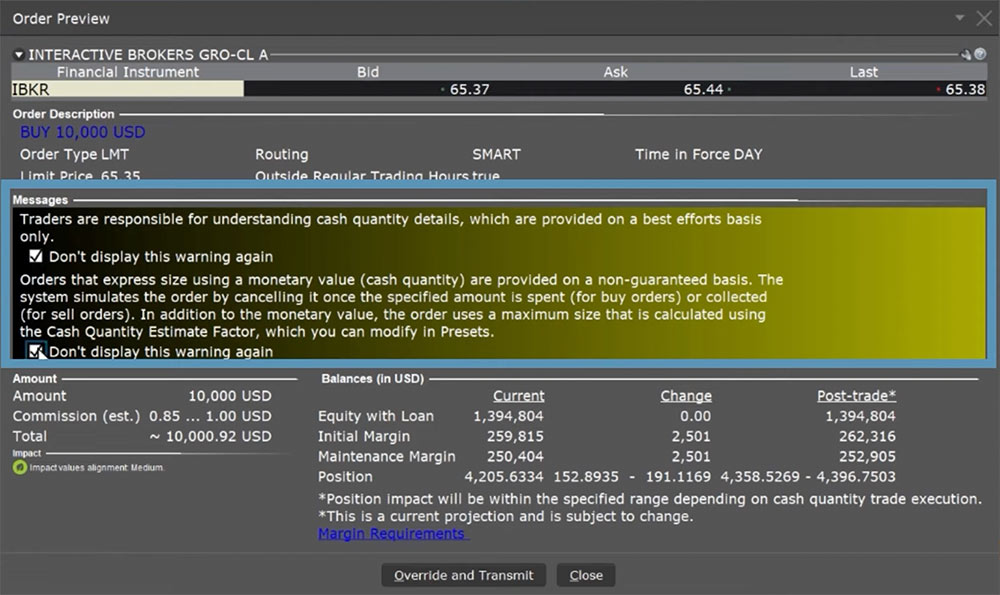• When you receive an information or confirmation message in TWS, we include a checkbox in the bottom left corner with the text “Don’t display this message again.”