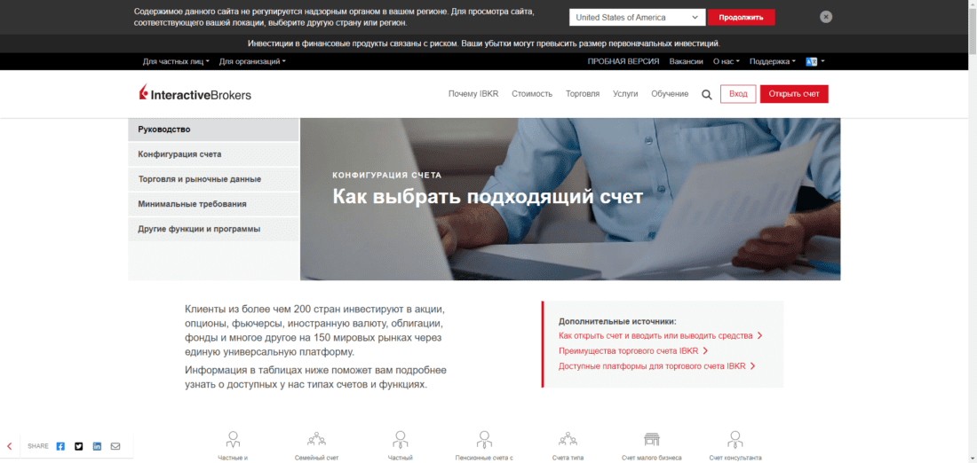В меню «Открыть счет» на нашем сайте вы можете найти руководство по выбору счета в виде удобных таблиц с описанием характеристик разных типов счетов, таких как индивидуальный, совместный, трастовый и пенсионный, счет профессионального или не профессионального консультанта, семейный, малого бизнеса, хедж-фонда, взаимного фонда, управляющего инвестициями и другие.