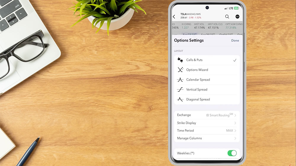 At the bottom choose whether to display weekly expirations and Market data. When satisfied with the Layout the investor taps “Done” to return to the Option Chain.