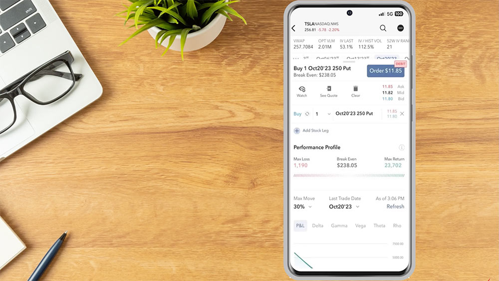 To enter a single leg option order using the option chain the investor taps on the Ask if they want to create a buy order or the Bid if they want to create a sell order. Once selected an order drawer will appear at the bottom of the screen Pulling the drawer up the investor will see details on the option selected such as the Performance Profile, Probability of Profit, Market Data, and the Greeks.