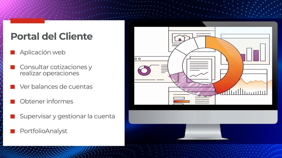 Por otro lado, el Portal del Cliente es una aplicación web fácil de usar, en la que los clientes pueden consultar cotizaciones y realizar operaciones, ver los balances de las cuentas, obtener informes y acceder a todas las herramientas y funciones que puedan necesitar para supervisar y gestionar su cuenta, incluido PortfolioAnalyst, una amplia herramienta analítica de consolidación, seguimiento y análisis de su cartera.