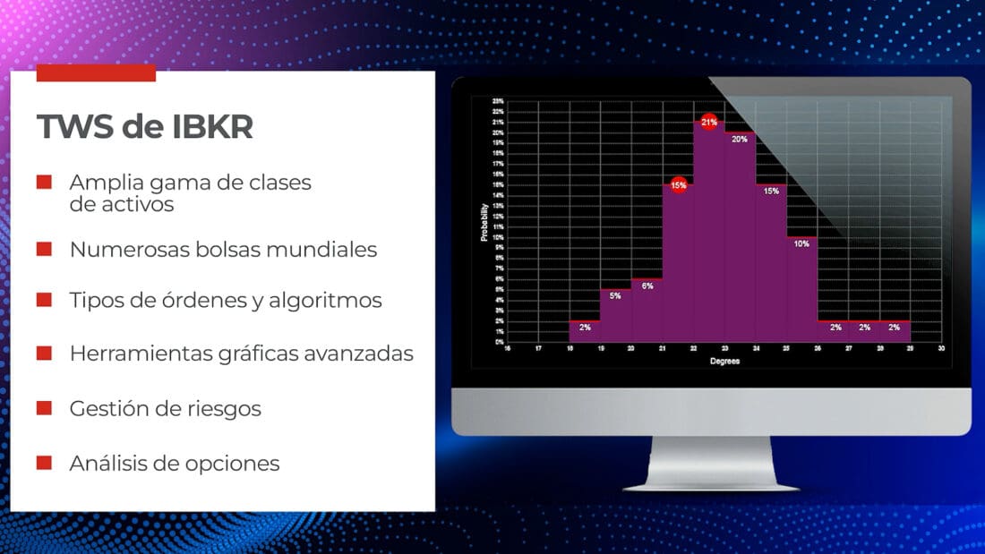 Además, como hemos destacado anteriormente, la emblemática Trader Workstation de IBKR es nuestra plataforma de negociación de escritorio diseñada para creadores de mercado, que permite a nuestros clientes negociar acciones, opciones, futuros, divisas y bonos, entre otras clases de activos, en una gran variedad de mercados internacionales. TWS ofrece una amplia gama de herramientas y servicios, incluido el acceso a varios tipos de órdenes y algoritmos, junto con herramientas avanzadas de gráficos, funciones de gestión de riesgos, análisis relacionados con opciones y mucho más.