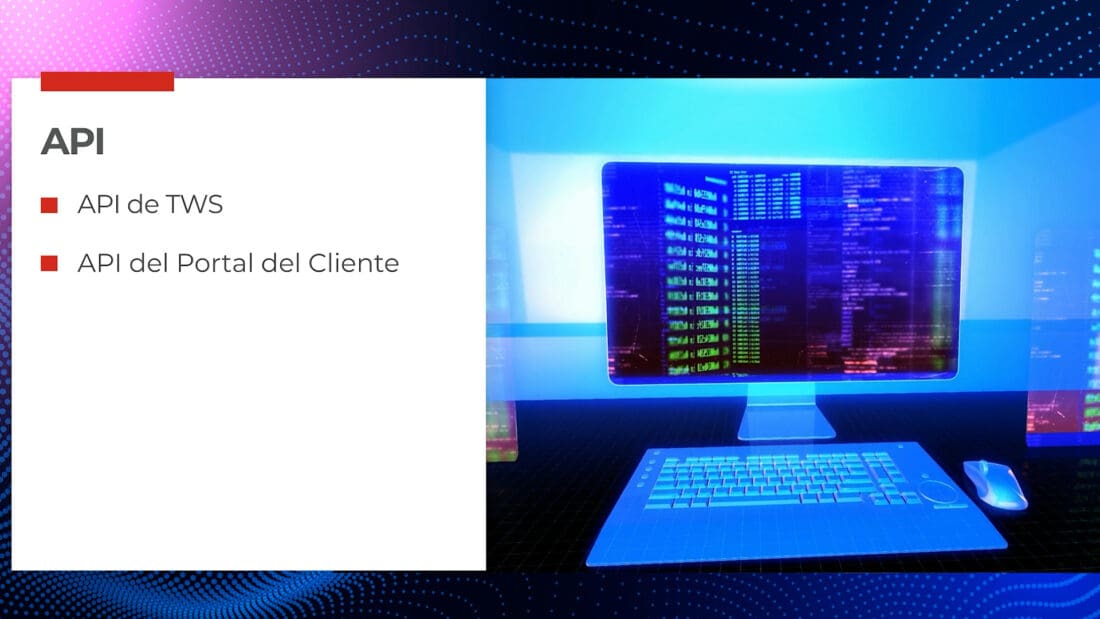 Y para aquellos que buscan soluciones de negociación utilizando una interfaz de programación de aplicaciones o API, IBKR ofrece la API de TWS. Esta es una interfaz sencilla, pero potente, para automatizar sus estrategias de negociación, así como supervisar el saldo de su cuenta y su cartera en tiempo real. También ofrecemos nuestra API del Portal del Cliente, que ofrece una integración sencilla, además de avisos informativos y muchas otras funciones que permiten a los clientes negociar, supervisar y gestionar sus cuentas.