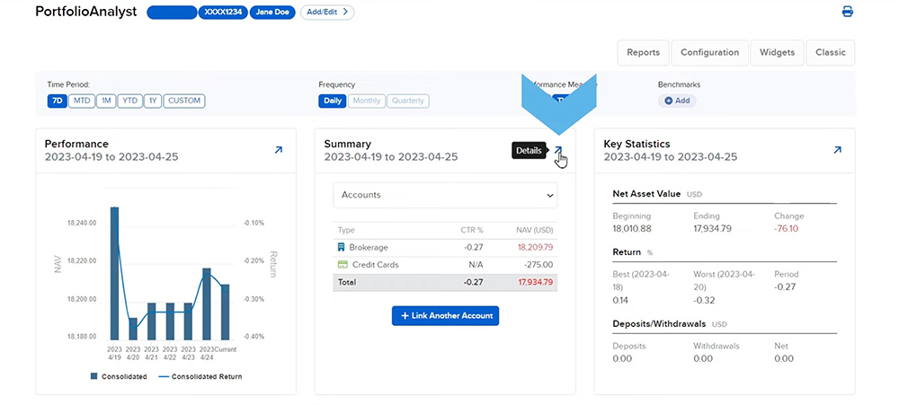Widgets allow the investor to create a customized view on the PortfolioAnalyst home page to see a variety of performance metrics.