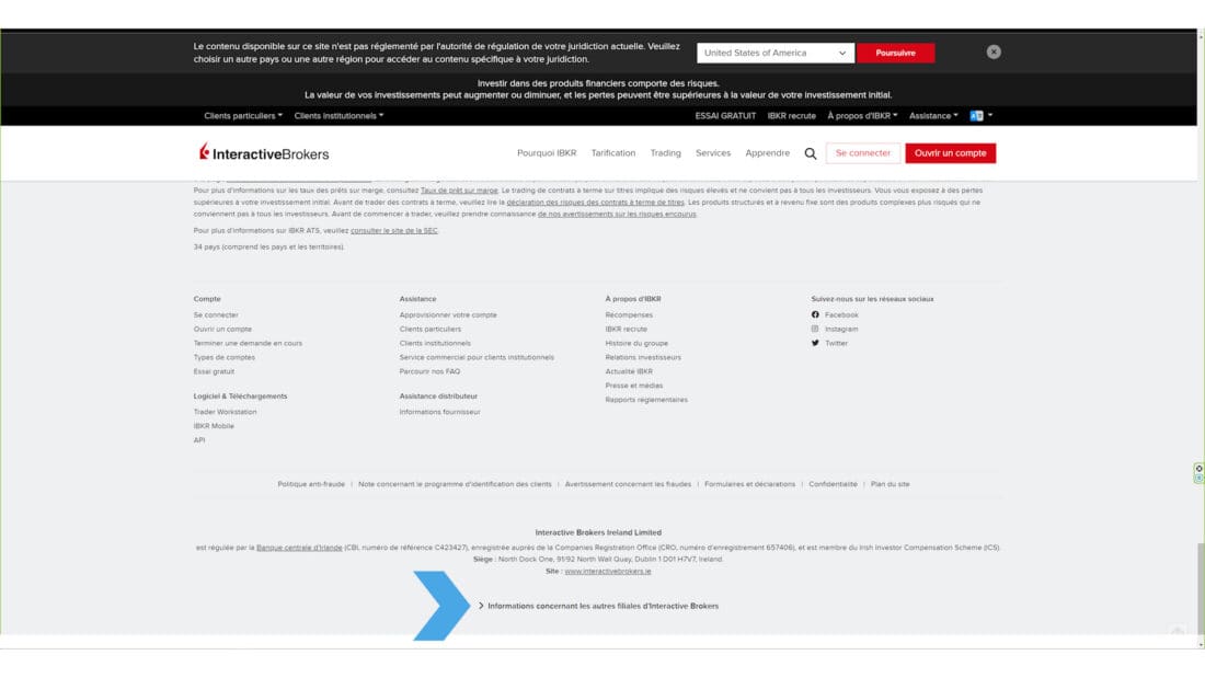 En vous rendant tout en bas de notre page d’accueil, vous trouverez des colonnes de liens regroupés par Compte, Logiciel et Téléchargements, Assistance, y compris l’Assistance distributeur, À propos d’IBKR, ainsi que des liens pour nous suivre sur les réseaux sociaux. Si vous cliquez sur « Plan du site », vous verrez tous les éléments de notre menu, ordonnés sur une seule page. Vous pouvez également trouver plus d’informations sur nos sociétés dans le monde entier et accéder à leur site.
