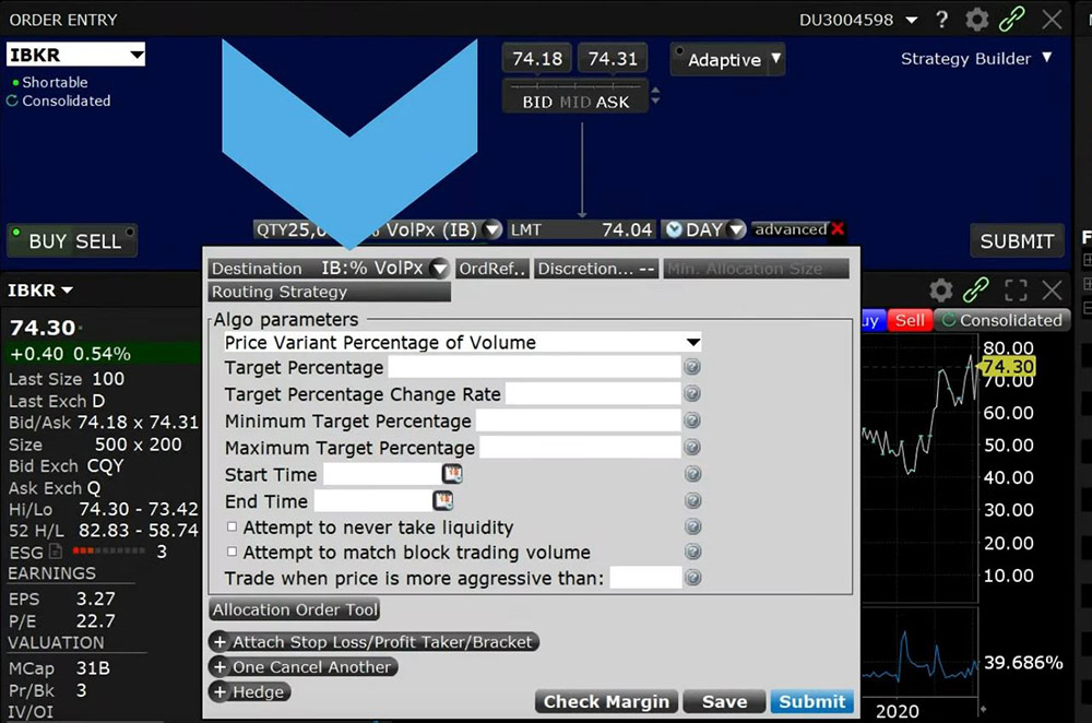 The Price Variant Percentage of Volume Algo is available for U.S. stocks and futures as well as some select non-US stocks and futures. This IB Algo is useful for larger size orders when you wish to minimize market impact on the price of the security. The Price Variant Percentage of Volume algo allows you to participate in volume at a user-defined rate that varies over the time selected depending on the market price of the security. For buy orders, the algo allows you to buy more aggressively when the price is low and be passive when the price is high. For sell orders, you can sell more aggressively when the price is high and be passive when the price is low.