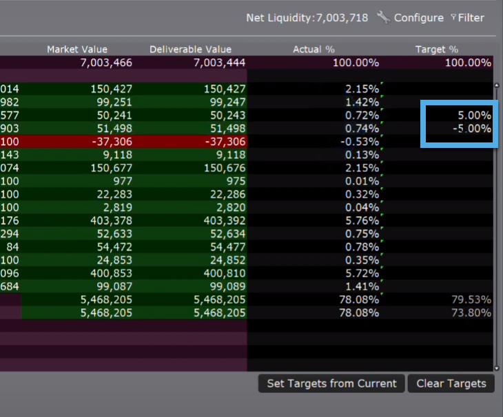 The Target % values can be cleared out by clicking on the “Clear Targets” button on the bottom right-hand side. Current Target % values may be entered in the row that you want to adjust.