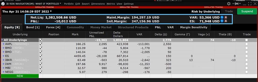 By default, Risk Navigator will display the margin requirements at the top based on the current margin configuration for your account.