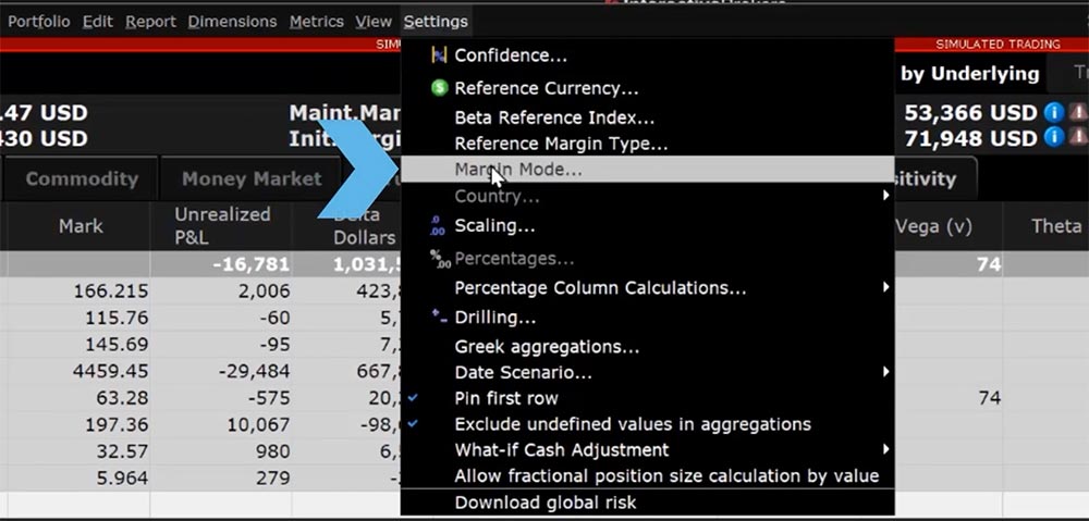 Additionally, Risk Navigator What-If Portfolios can be used to view the projected changes for your portfolio in the event that IB implements changes to the margin requirements based on market conditions. When such changes are made, a new Alternative Margin Calculator will be released so that clients can view their projected margin requirements once the changes are implemented. To open the Alternative Margin Calculator within a What-If portfolio, select Settings at the top menu and click Margin Mode.
